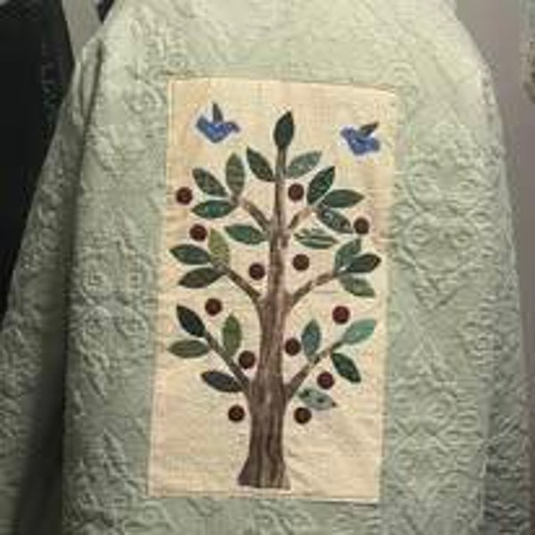 Up cycled quilt into a beautiful green hoodie with applique designs added. Size large to extra large