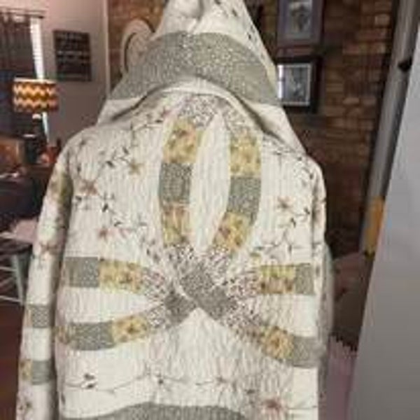 Beautiful pastel color patch work quilt with embroidered floral design up cycled into coat featuring over sized pockets, hood and vintage buttons size large