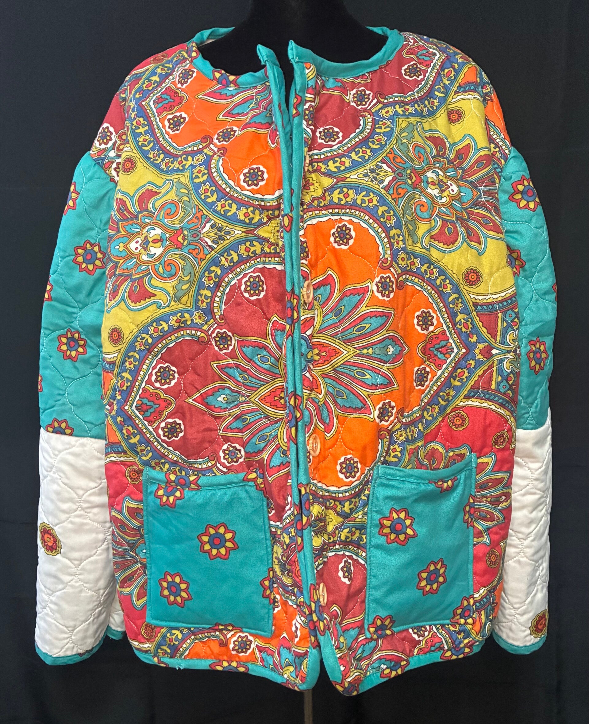 Beautiful Teal Pattern Quilt Coat with Buttons + 2 Front Pockets - XL