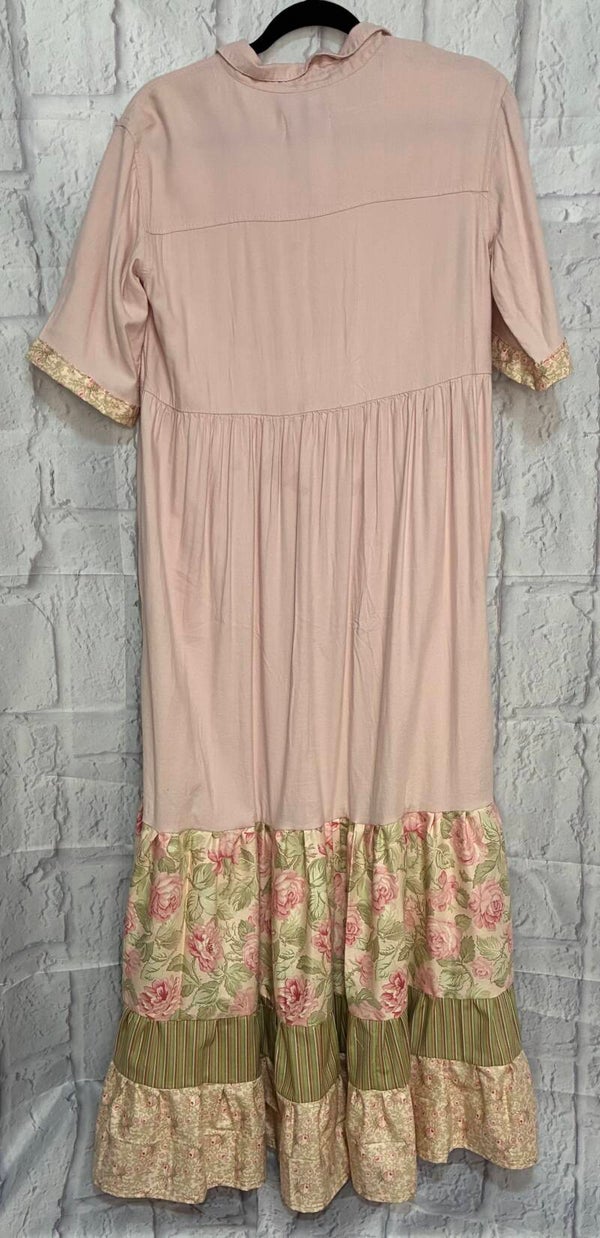 Size XL - Long Pink Floral Dress with Front Pockets + Collar with Buttons
