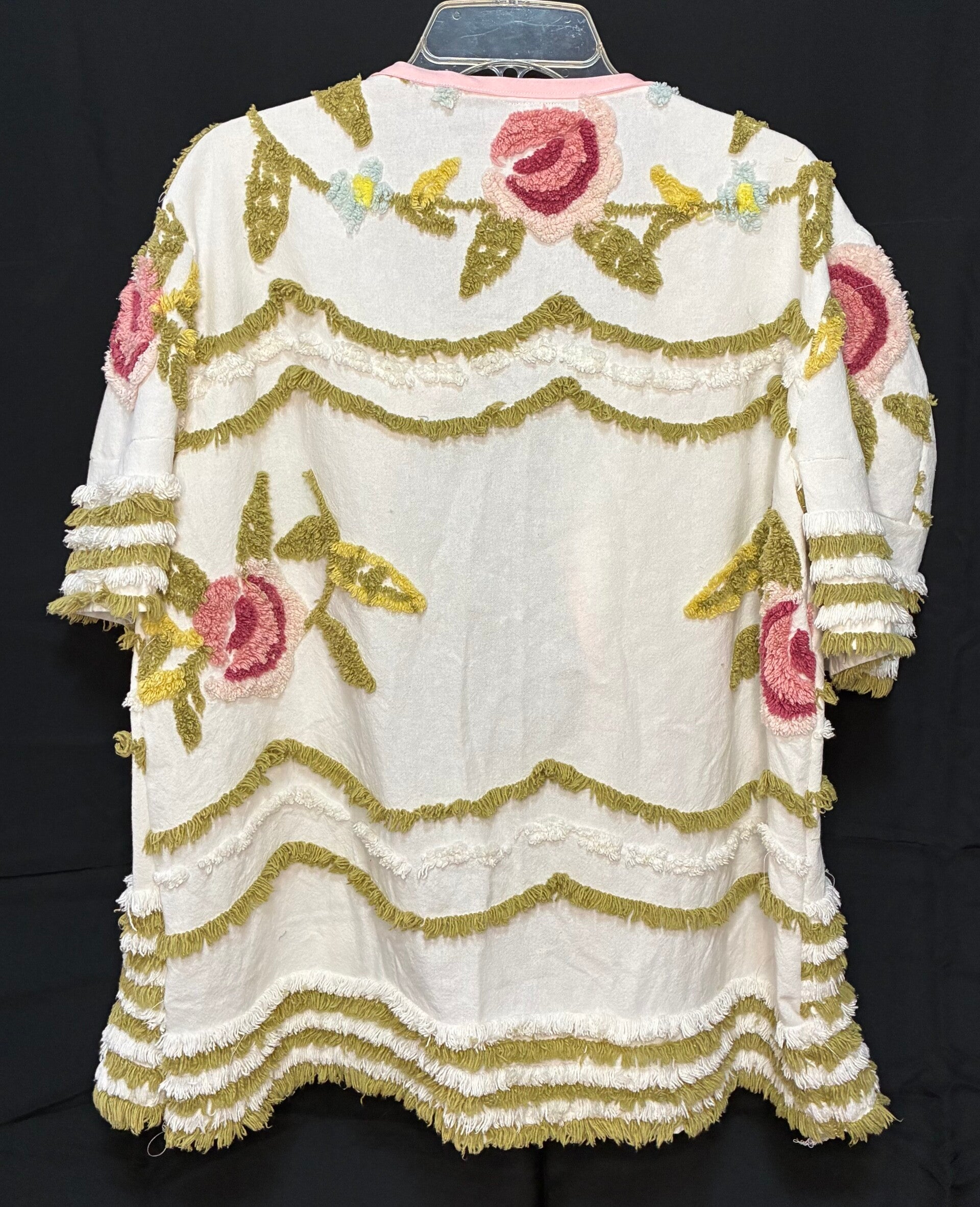 Handmade up-cycle chenille White - Floral - Textured open Cardigan up-cycled from vintage chenille bedspread