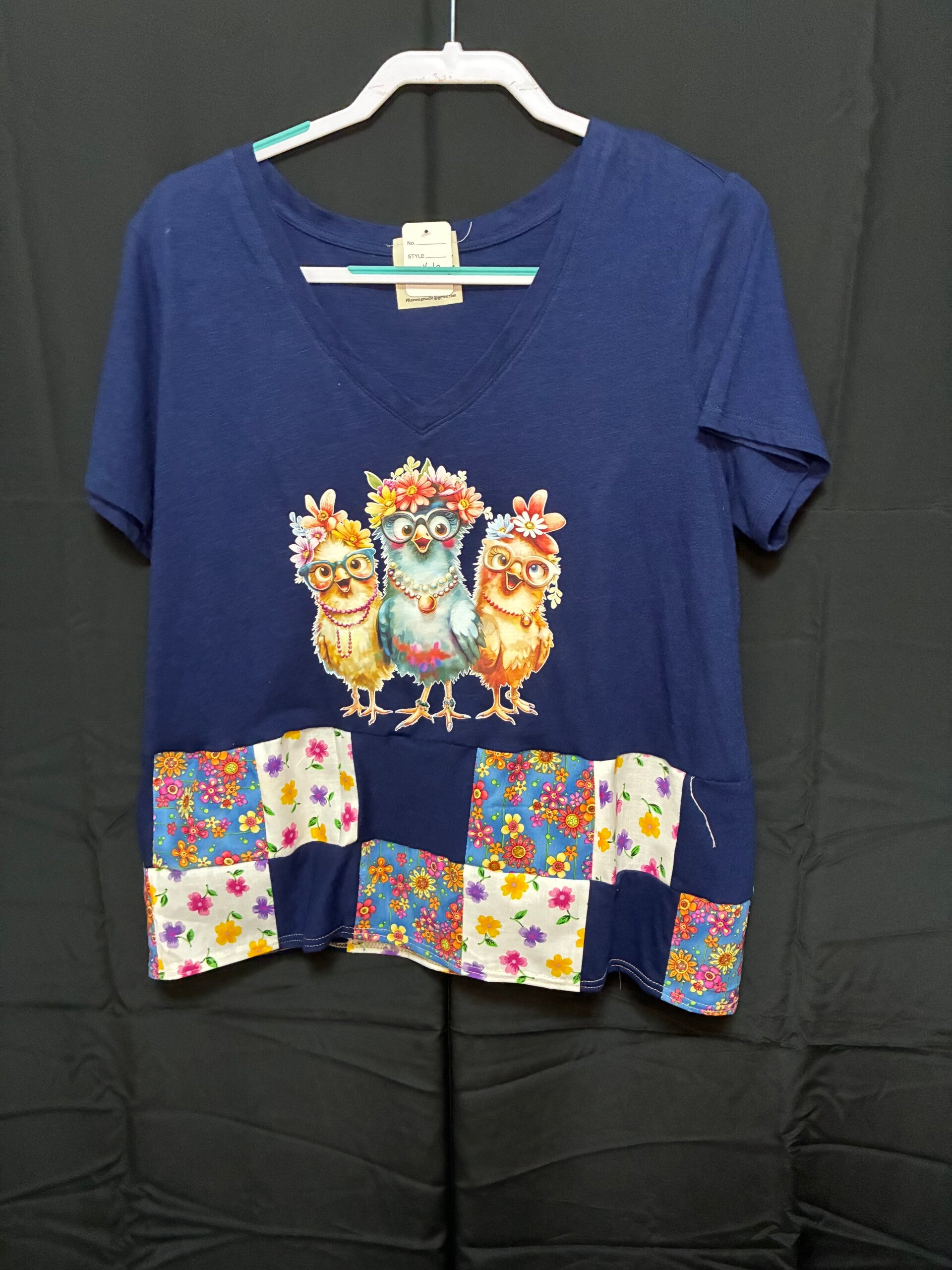 Size XLG - Blue Up Cycle Kantha Tee - 3 Decorative Birds