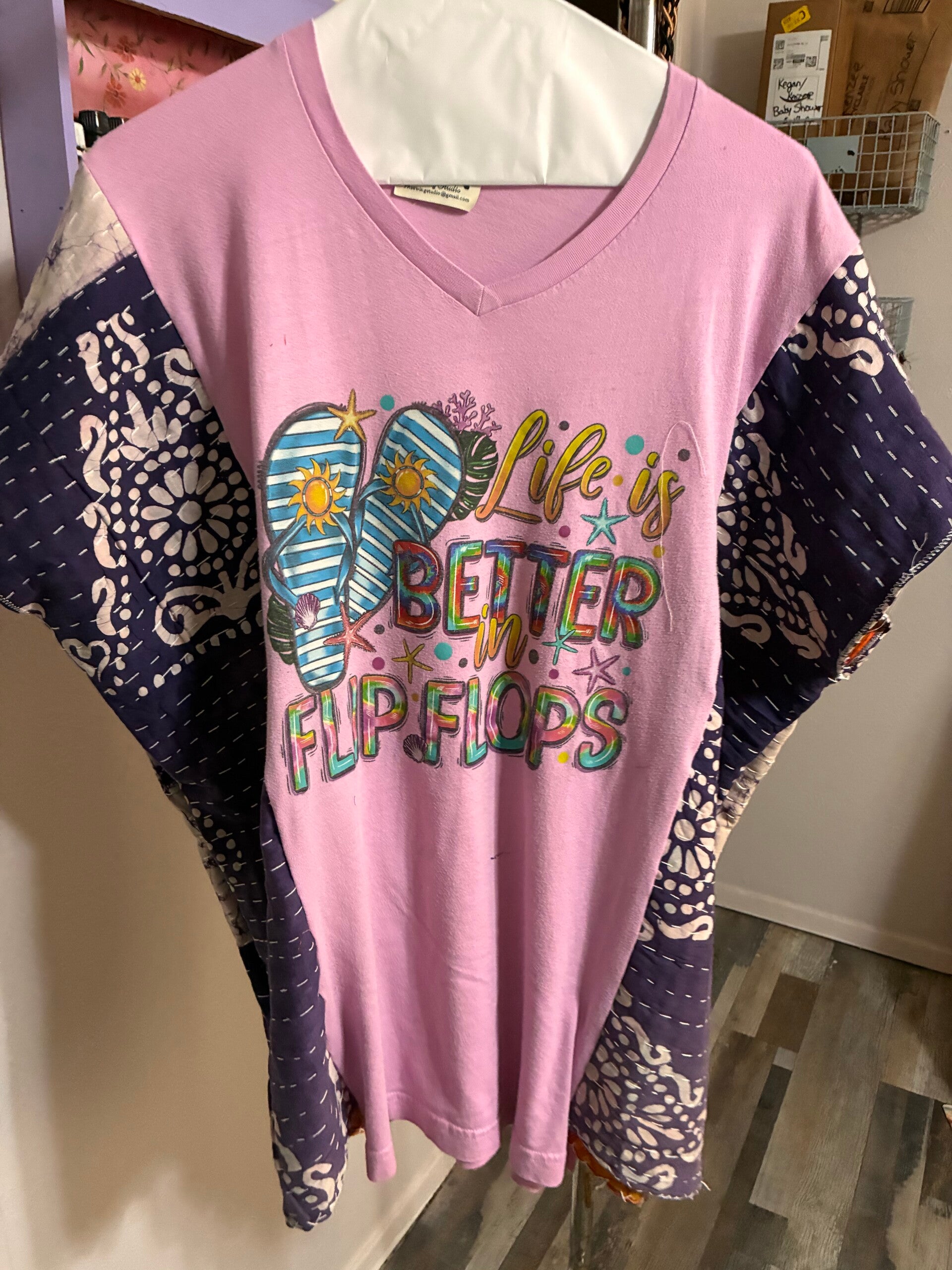 This one-of-a-kind upcycled beachy tee is the perfect mix of fun, comfort, and laid-back summer vibes. Featuring a soft pink body with a playful “Life is Better in Flip Flops” graphic and stunning handmade kantha-style poncho sleeves in a bold navy floral print, this top is made to stand out.